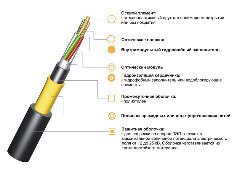 | Описание | Оптический кабель применяется для подвески между зданиями и сооружениями, на опорах ВЛС, опорах контактной сети и автоблокировки электрифицированных железных дорог, на опорах ЛЭП, а также навивка, присоединение и прикрепление к внешним несущим силовым элементам (тросам, проводам и т.п.) в точках с максимальной величиной потенциала электрического поля до 12 кВ | |||||||||||